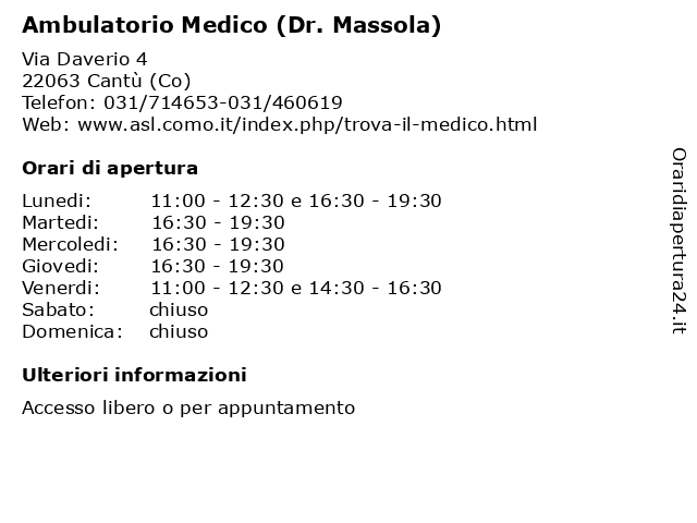 1 Dott. Giovanni Massola (distanza: 0,51 km) Via G. Matteotti 33, 22063 Cantù ambulatorio, assistenza, cure mediche, dott., giovanni, massola, sanità, servizi ai cittadini 2 Dott. Giovanni Massola (distanza: 2,92 km) Via Umbria 7, 22063 Cantù ambulatorio, assistenza, cure mediche, dott., giovanni, massola, sanità, servizi ai cittadini 3 Ambulatorio Medico (Dr.ssa Meda) (distanza: 0,25 km) Largo Adua 1, 22063 Cantù (Co) (dr.ssa, ambulatorio, ambulatorio comunale, cura, dottore, dottoressa, meda), medico, pazienti, visite 4 Commissione Medica Locale: prenotazione visite patenti (distanza: 0,33 km) Via Cavour 10, 22063 Cantù (Co) ambulatorio, ambulatorio comunale, commissione, cura, dottore, dottoressa, locale, medica, patenti, pazienti, prenotazione, visite 5 Ambulatorio Medico (Dr. Guglielmini) (distanza: 0,34 km) Largo Adua 7/a, 22063 Cantù (Co) (dr., ambulatorio, ambulatorio comunale, cura, dottore, dottoressa, guglielmini), medico, pazienti, visite 6 Ambulatorio Medico (Dr. Scolari) (distanza: 0,34 km) L.go Adua 7, 22063 Cantù (Co) (dr., ambulatorio, ambulatorio comunale, cura, dottore, dottoressa, medico, pazienti, scolari), visite |