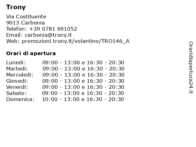 1 Trony (distanza: 0,01 km) Via Costituente s.n.c., 09013 Carbonia eletronica, informatica, telefonia, trony 2 Trony (distanza: 47,49 km) Viale Monastir Km 15,000 s.n.c., 09026 San Sperate eletronica, informatica, telefonia, trony 6 |