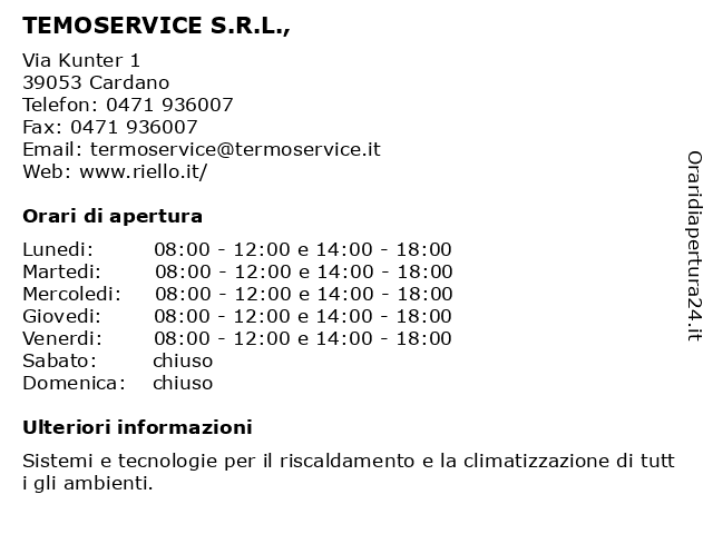 | Lunedi | 08:00-12:00 e 14:00-18:00 |
