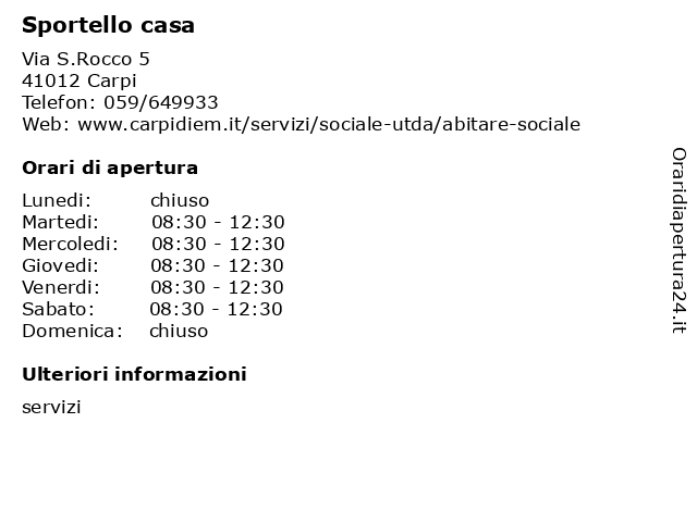 1 Regione emilia romagna:Sportello ACER (riservato inquilini ERP) (distanza: 0,00 km) Via San Rocco 5, 41012 Carpi (riservato, acer, comune, emilia, erp), inquilini, regione, romagna, sportello, uffici 2 Sportello ACG Affitto Casa Garantito (distanza: 0,00 km) Via Campo San Rocco 5, 41012 Carpi (affitto, acg, affitto, agenzia, casa, comune, emilia, garantito, l'affitto), per, regione, romagna, sociale, sportello, uffici 3 Regione Emilia Romagna:Sportello Casa Comune Carpi (distanza: 0,00 km) Via San Rocco 5, 41012 Carpi carpi, casa, comune, emilia, regione, romagna, sportello, uffici 4 Centro per le Famiglie,Sportello informaffido (distanza: 0,27 km) viale De Amicis 59, 41012 Carpi assistenza, centro, famiglie, informaffido, le, per, servizi, sportello 5 Sportello Informafamiglie & bambini (distanza: 0,27 km) viale De Amicis 59, 41012 Carpi assistenza, bambini, informafamiglie, servizi, sportello 6 Sportello Informaffido (distanza: 0,27 km) viale De Amicis 59, 41012 Carpi assistenza, informaffido, servizi, sportello |