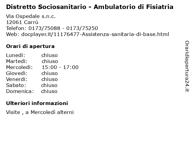 1 Distretto Sociosanitario - Ambulatorio di Fisiatria (distanza: 0,00 km) Via Ospedale s.n.c., 12061 Carrù ambulatorio, di, distretto, fisiatria, sanitario, sociosanitario 2 Distretto Sociosanitario - Sportello Amministrativo (distanza: 0,00 km) Via Ospedale s.n.c., 12061 Carrù amministrativo, distretto, sanitario, sociosanitario, sportello 3 Distretto Sociosanitario - Sportello Amministrativo (distanza: 7,90 km) Via Ospedale s.n.c., 12063 Dogliani amministrativo, distretto, sanitario, sociosanitario, sportello 4 Distretto Sociosanitario - Sportello Amministrativo (distanza: 11,12 km) Corso Statuto 13, 12084 Mondovì amministrativo, distretto, sanitario, sociosanitario, sportello 5 Distretto Sociosanitario - Sportello Amministrativo (distanza: 11,62 km) Via A. Nielli 93, 12089 San Michele Mondovì amministrativo, distretto, sanitario, sociosanitario, sportello 6 Distretto Sociosanitario - Uff. Amm. Ex Saub (distanza: 15,69 km) Via XX Settembre 3, 12089 Ceva amm., distretto, ex, sanitario, saub, sociosanitario, uff. |