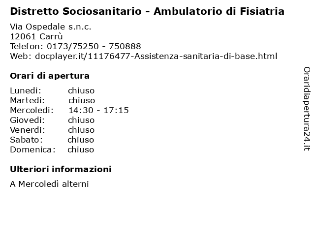 1 Distretto Sociosanitario - Ambulatorio di Fisiatria (distanza: 0,00 km) Via Ospedale s.n.c., 12061 Carrù ambulatorio, di, distretto, fisiatria, sanitario, sociosanitario 2 Distretto Sociosanitario - Sportello Amministrativo (distanza: 0,00 km) Via Ospedale s.n.c., 12061 Carrù amministrativo, distretto, sanitario, sociosanitario, sportello 3 Distretto Sociosanitario - Sportello Amministrativo (distanza: 7,90 km) Via Ospedale s.n.c., 12063 Dogliani amministrativo, distretto, sanitario, sociosanitario, sportello 4 Distretto Sociosanitario - Sportello Amministrativo (distanza: 11,12 km) Corso Statuto 13, 12084 Mondovì amministrativo, distretto, sanitario, sociosanitario, sportello 5 Distretto Sociosanitario - Sportello Amministrativo (distanza: 11,62 km) Via A. Nielli 93, 12089 San Michele Mondovì amministrativo, distretto, sanitario, sociosanitario, sportello 6 Distretto Sociosanitario - Uff. Amm. Ex Saub (distanza: 15,69 km) Via XX Settembre 3, 12089 Ceva amm., distretto, ex, sanitario, saub, sociosanitario, uff. |