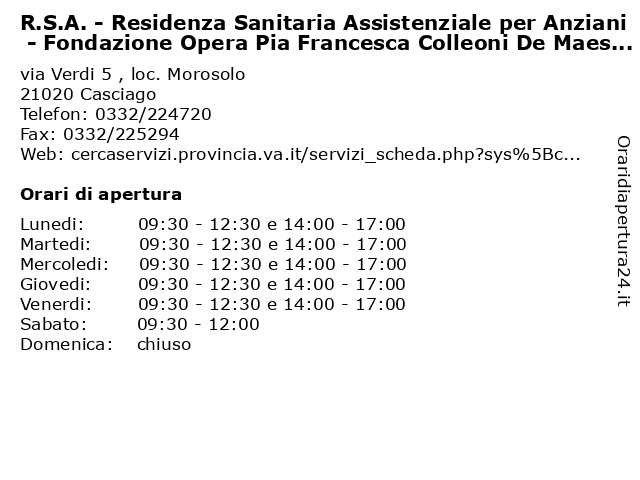 1 R.S.A. - Residenza Sanitaria Assistenziale per Anziani - Fondazione Opera Pia Francesca Colleoni De Maestri Onlus e Casa di Riposo 'Cardinal Colombo' (Orario Visite ai Parenti) (distanza: 0,00 km) via Verdi 5 , loc. Morosolo, 21020 Casciago 'cardinal, (orario, ai, anziani, anziano, assistenziale, casa, case, centri anziani, colleoni, colombo', cura, de, di, fondazione, francesca, maestri, onlus, opera, orario, parenti, per, pia, r.s.a., residenza, riposo, sanitaria, visite 2 R.S.A. - Residenza Sanitaria Assistenziale per Anziani - Villa Rovera Molina (Orario Visite ai Parenti) (distanza: 2,37 km) via Lunga 57, 21020 Barasso (orario, ai, anziani, anziano, assistenziale, centri anziani, molina, parenti), per, per anziani, r.s.a., residenza, rovera, rsa, sanitaria, servizi residenziali anziani, struttira per anziani, villa, visite 3 R.S.A. - Residenza Sanitaria Assistenziale per Anziani - Villa Rovera Molina (Orario Referente per Informazioni) (distanza: 2,37 km) via Lunga 57, 21020 Barasso (orario, anziani, anziano, assistenziale, centri anziani, informazioni), molina, per, per anziani, r.s.a., referente, residenza, rovera, rsa, sanitaria, servizi residenziali anziani, struttira per anziani, villa 4 R.S.A. - Residenza Sanitaria Assistenziale per Anziani - Villa Molina (Orario Visite ai Parenti) (distanza: 4,86 km) via Brunico snc, 21100 Varese (orario, ai, anziani, anziano, assistenziale, centri anziani, molina, parenti), per, per anziani, r.s.a., residenza, rsa, sanitaria, servizi residenziali anziani, struttira per anziani, villa, visite 5 Sportello Abilitato all'Attivazione Tessera Sanitaria TS - CNS (distanza: 4,86 km) Via Cappuccini sn, 37013 Caprino Varese abilitato, all'attivazione, ambulatorio, assistenza, cns, cure mediche, sanitaria, sanità, servizi ai cittadini, sportello, tessera, ts 6 Prefettura - Ufficio Rimborso spese assistenza sanitaria (distanza: 5,00 km) Via Frattini 1, 21100 Varese assistenza, polizia, prefettura, rimborso, sanitaria, servizi, spese, ufficio |