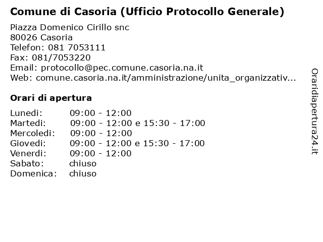 1 Comune di Casoria (Ufficio Protocollo Generale) (distanza: 0,04 km) Piazza Domenico Cirillo 10, 80026 Casoria (ufficio, amministrazione, amministrazione trasparente, assessore, casoria, comunale, comune, di, generale), giunta comunale, pratiche comunali, protocollo, sindaco, sportello, ufficio comunale 2 Distretto Sanitario n° 43 - Protocollo (distanza: 0,71 km) Via Alcide De Gasperi 43, 80026 Casoria 43, ambulatorio, assistenza, cure mediche, distretto, n°, protocollo, sanitario, sanità, servizi ai cittadini 3 Distretto Sanitario n. 47 - Protocollo (distanza: 3,94 km) Via Ravello 3/4, 80013 Casalnuovo 47, ambulatorio, assistenza, cure mediche, distretto, n., protocollo, sanitario, sanità, servizi ai cittadini 4 ASL Napoli 3 SUD Distretto 51 (Ufficio Protocollo) (distanza: 7,78 km) Piazza Sant'Agnese snc, 80038 Pomigliano D'Arco (ufficio, 51, asl, distretto, napoli, ospedali, protocollo), salute, sud 5 Istituto Tecnico Industriale E. Medi (Segreteria protocollo) (distanza: 8,62 km) Via Buongiovanni 84, 80046 Napoli (segreteria, associazioni, e., fondazioni istituti, industriale, istituto, medi, protocollo), tecnico 6 Distretto Sanitario 51 - Unità Operativa Veterinaria: Ufficio Protocollo (distanza: 8,82 km) Piazza Sant'Agnese s.n.c., 80038 Pomigliano d'Arco (NA) 51, ambulatorio, assistenza, cure mediche, distretto, operativa, protocollo, sanitario, sanità, servizi ai cittadini, ufficio, unità, veterinaria |