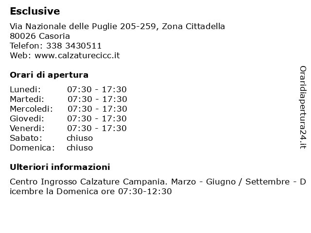 1 Esclusive (Gennaio, Febbario, Luglio, Agosto) (distanza: 3,02 km) Via Nazionale delle Puglie 205\259, 60026 Casoria (gennaio, agosto), esclusive, febbario, ingrosso, luglio, scarpe 2 Esclusive (da Marzo a Giugno e da Settembre a Dicembre) (distanza: 3,02 km) Via Nazionale delle Puglie 205\259, 60026 Casoria (da, (orari, da, dicembre), esclusive, giugno, ingrosso, marzo, scarpe, settembre 3 Esclusive Car Service NCC Napoli (distanza: 6,92 km) Via Pandolfo Collenuccio , 80136 Napoli car, esclusive, napoli, ncc, service 4 Carthusia (distanza: 3,99 km) Via Del Riposo 95, 80144 Napoli accessori, carthusia, casa, essenze esclusive, gioielli, profumi 5 Rosario Cosimo Agesv Associazione delle Guide Esclusive del PNV Onlus (distanza: 20,75 km) Piazza G. Ungaretti 12, 81100 Caserta agesv, aiuto, aiuto ai cittadini, associazione, cosimo, del, delle, esclusive, guide, informazione, onlus, pnv, rosario, tutela ai cittadini, volontariato 6 Rosario Cosimo AGESV Associazione delle Guide Esclusive del PNV Onlus (distanza: 20,75 km) Piazza G. Ungaretti 12, 81100 Caserta agesv, associazione, cosimo, del, delle, esclusive, guide, onlus, pnv, rosario, turismo, vacanze, viaggi |