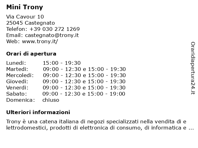 5 Trony via Ducco Brescia (distanza: 9,00 km) Via Marcantonio Ducco 81, 25123 Brescia brescia, ducco, trony 6 Trony (distanza: 9,00 km) Via Ducco 81, 25123 Brescia (BS) accessori pc, consolo, giochi, supermedia, technoclogia, trony |