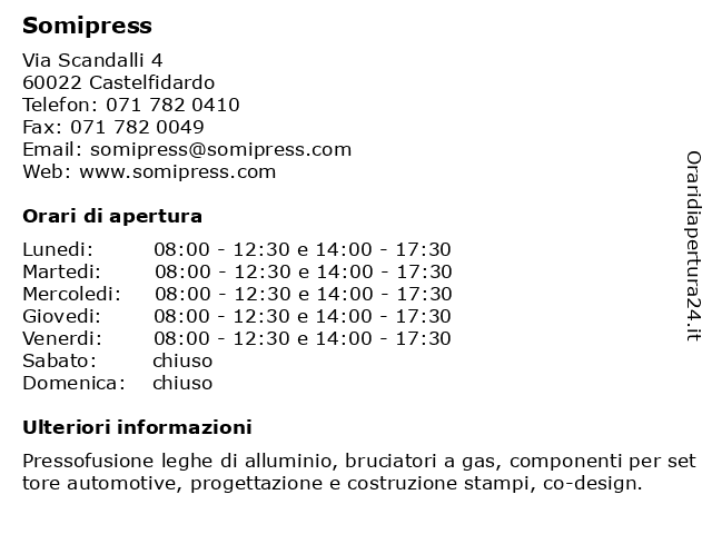 | Venerdi | 08:00-12:30 e 14:00-17:30 |