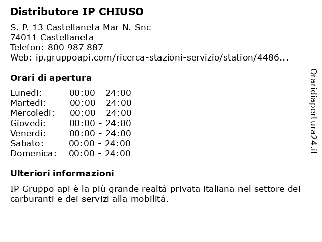 1 Stazione Di Servizio IP (distanza: 0,32 km) Strada Provinciale 13 s.n.c, 74011 Castellaneta benzina, di, gasolio, ip, service, servizio, stazione, stazione di benzina, stazioni 2 Distributore IP (distanza: 10,57 km) S.s. 580 Km.13+966 , 74013 Ginosa distributore, fornitore di benzina, fornitore di carburante diesel, ip, stazione di servizio per il cambio dell'olio, stazione di servizio per il soccorso stradale 3 Distributore IP (distanza: 13,20 km) Ss 106 Km 478 +512, 74016 Massafra distributore, fornitore di benzina, fornitore di carburante diesel, ip, stazione di servizio per il cambio dell'olio, stazione di servizio per il soccorso stradale 4 Stazione Di Servizio IP (distanza: 15,02 km) Strada Statale 580 Km.13+966 s.n.c, 74013 Ginosa benzina, di, gasolio, ip, service, servizio, stazione, stazione di benzina, stazioni 5 Stazione Di Servizio IP (distanza: 15,11 km) Via Puglie s.n.c, 74013 Ginosa benzina, di, gasolio, ip, service, servizio, stazione, stazione di benzina, stazioni 6 Distributore IP (distanza: 15,23 km) Via Puglie , 74013 Ginosa distributore, fornitore di benzina, fornitore di carburante diesel, ip, stazione di servizio per il cambio dell'olio, stazione di servizio per il soccorso stradale |
