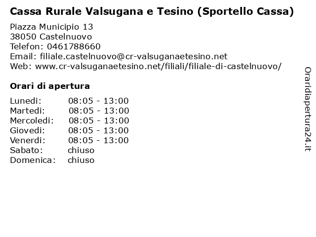 1 Cassa Rurale Valsugana e Tesino (ATM/Cassa Continua) (distanza: 0,00 km) Piazza Municipio 13, 38050 Castelnuovo (atm/cassa, banca, bancomat, cassa, contanti, continua), finanziamenti, mutui, prelievi, risparmi, rurale, soldi, tesino, valsugana 2 Cassa Rurale Valsugana e Tesino (Sportello Consulenza) (distanza: 0,00 km) Piazza Municipio 13, 38050 Castelnuovo (sportello, banca, bancomat, cassa, consulenza), contanti, finanziamenti, mutui, prelievi, risparmi, rurale, soldi, tesino, valsugana 4 Valsugana Vetri (distanza: 1,03 km) Località Broletti 24, 38050 Castelnuovo design, installazione, operatore, valsugana, vetri, vetro 6 CASSA RURALE OLLE-SAMONE-SCURELLE B.C.C. (distanza: 1,91 km) Via Xv Agosto 37 A, 38050 Scurelle b.c.c., carta prepagata my wu, cassa, conto bancario, incassare denaro, inviare denaro online, money transfer, my wu, olle, pagamenti internazionali, pagamento cash, pagamento online, quick pay, ricevere denaro, rurale, samone, scurelle, spedire denaro, trasferimento denaro, trasferimento di denaro a un conto bancario |