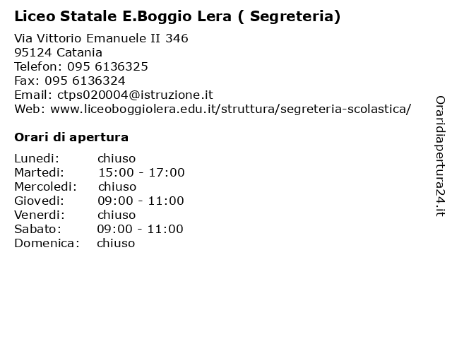 1 Liceo Classico Statale Nicola Spedalieri – Catania (orario segreteria didattica) (distanza: 0,38 km) Piazza Annibale Riccò, s.n.c, 95124 Catania (orario, catania, classico, didattica), liceo, nicola, scuole, segreteria, segreterie, spedalieri, statale 2 Liceo Classico Statale Nicola Spedalieri – Catania (orario segreteria amministrativa) (distanza: 0,38 km) Piazza Annibale Riccò s.n.c, 95124 Catania (orario, amministrativa), catania, classico, liceo, nicola, scuole, segreteria, segreterie, spedalieri, statale 3 Istituto Comprensivo Statale Dusmet - Doria (Ufficio Didattica - Case Sante) (distanza: 0,67 km) Via Case Sante snc, 95121 Catania (ufficio, case, comprensivo, didattica, doria, dusmet, istituto, istituto scolastico, sante), scuola, statale 4 Istituto Comprensivo Statale Dusmet - Doria (Ufficio Personale - Case Sante) (distanza: 0,67 km) Via Case Sante snc, 95121 Catania (ufficio, case, comprensivo, doria, dusmet, istituto, istituto scolastico, personale, sante), scuola, statale 5 Liceo Statale G. Turrisi Colonna (Segreteria didattica) (distanza: 1,03 km) Via Fabio Filzi 24, 95124 Catania (segreteria, colonna, didattica), g., istituto scolastico, liceo, scuola, statale, turrisi 6 Istituto Comprensivo Statale Coppola - De Sanctis (Segreteria) (distanza: 1,09 km) Via Medaglie d'Oro 25, 95124 Catania (segreteria), comprensivo, coppola, de, istituto, istituto scolastico, sanctis, scuola, statale |