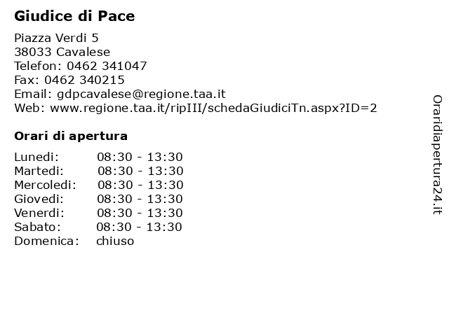 1 2 Giudice Di Pace Di Cavalese (distanza: 0,00 km) Piazza Verdi 5, 38033 Cavalese cavalese, giudice, legislativi, organi, pace 3 Giudice Di Pace Di Egna (distanza: 14,72 km) Via Bolzano 31, 39044 Egna egna, giudice, legislativi, organi, pace 5 Procura di Trento - Segreteria Giudice di Pace (distanza: 35,89 km) Largo Pigarelli 1, 38122 Trento di, giudice, pace, procura, provvedimenti, segreteria, sentenze, trento, udienze 6 Studio Dentistico Dott.Fabio Pace (distanza: 37,73 km) Via Marighetto 10, 38123 Trento dentistico, dott.fabio, dr pace, pace, studio, studio dentistico, trento |