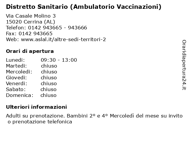 1 Distretto Sanitario (Ambulatorio Vaccinazioni) (distanza: 11,52 km) Viale Ortigara 4, 13039 Trino (ambulatorio, ambulatorio, assistenza, cure mediche, distretto, sanitario, sanità, servizi ai cittadini, vaccinazioni, vaccinazioni) 2 Distretto Sanitario (Ufficio Pratiche Amministrative) (distanza: 0,00 km) Via Casale Molino 3, 15020 Cerrina (AL) (ufficio, ambulatorio, amministrative, amministrative), assistenza, cure mediche, distretto, pratiche, sanitario, sanità, servizi ai cittadini, ufficio 3 Distretto Sanitario (Prelievi) (distanza: 0,00 km) Via Casale Molino 3, 15020 Cerrina (AL) (prelievi), (servizio, ambulatoriali, ambulatorio, distretto, distrettuale), infermieristico, ospedale, prelievi, punto prelievi, sanitario 4 Distretto Sanitario (Ambulatorio Medicazioni e Terapia Iniettiva) (distanza: 0,00 km) Via Casale Molino 3, 15020 Cerrina (AL) (ambulatorio, ambulatorio, assistenza, cure mediche, distretto, iniettiva, iniettiva), medicazioni, sanitario, sanità, servizi ai cittadini, terapia 5 Distretto Sanitario (Ambulatorio di Diabetologia) (distanza: 0,00 km) Via Casale Molino 3, 15020 Cerrina (AL) (ambulatorio, ambulatorio, assistenza, cure mediche, dell'adulto, di, diabetologia), distretto, sanitario, sanità, servizi ai cittadini, vaccinazioni 6 Distretto Sanitario (Ambulatorio di Chirurgia) (distanza: 2,33 km) Via Casale Molino 3, 15020 Cerrina (AL) (ambulatorio, ambulatorio, assistenza, chirurgia, chirurgia), cure mediche, di, distretto, sanitario, sanità, servizi ai cittadini |