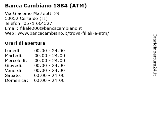 1 Banca di Cambiano (bancomat) (distanza: 8,32 km) Via G. Boccaccio 16, 50052 Certaldo (bancomat), banca, cambiano, di, prelievi, versamenti 2 Banca di Cambiano (bancomat) (distanza: 9,38 km) Via IV Novembre 1/A, 53037 San Gimignano (bancomat), banca, cambiano, di, prelievi, versamenti 3 Banca di Cambiano (bancomat) (distanza: 14,08 km) Piazza del Popolo 1, 50051 Castelfiorentino (bancomat), banca, cambiano, di, prelievi, versamenti 4 Banca Cambiano (ATM) (distanza: 15,77 km) Piazza Giovanni XXIII 6, 50051 Castelfiorentino (atm), (bancomat), banca, cambiano, prelievi, versamenti 5 Banca di Cambiano (bancomat) (distanza: 20,13 km) Via della Piovola 138, 50053 Empoli (bancomat), banca, cambiano, di, prelievi, versamenti 6 Banca di Cambiano (bancomat) (distanza: 20,55 km) Via Madre Teresa di Calcutta 8, 50050 Capraia e Limite (bancomat), banca, cambiano, di, prelievi, versamenti |