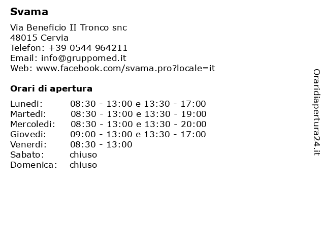 | Mercoledi | 08:30-13:00 e 13:30-20:00 |