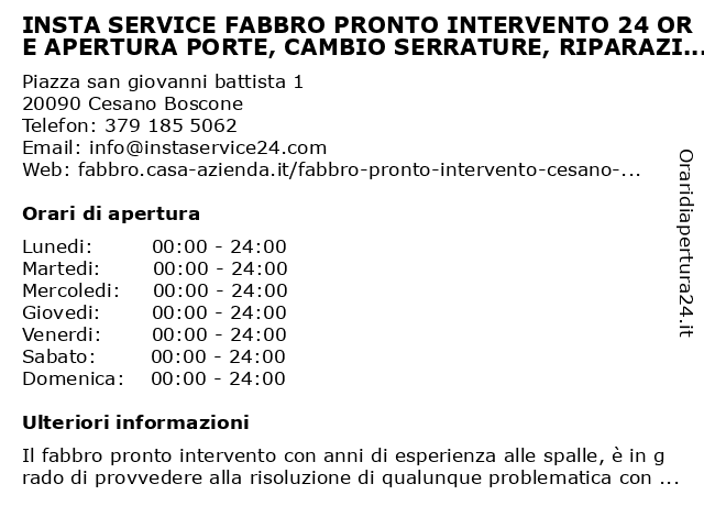 1 INSTA SERVICE FABBRO PRONTO INTERVENTO 24 ORE APERTURA PORTE, CAMBIO SERRATURE, RIPARAZIONE SERRANDE E TAPPARELLE, APERTURA CASSEFORTI (distanza: 2,18 km) Via dante alighieri 14, 20094 Corsico 24, apertura, cambio, casseforti, insta, intervento, ore, porte, pronto, riparazione, serrande, serrature, service fabbro, tapparelle 2 INSTA SERVICE FABBRO PRONTO INTERVENTO 24 ORE APERTURA PORTE, CAMBIO SERRATURE, RIPARAZIONE SERRANDE E TAPPARELLE, APERTURA CASSEFORTI (distanza: 3,00 km) Via giacomo leopardi 23, 20090 Buccinasco 24, apertura, cambio, casseforti, insta, intervento, ore, porte, pronto, riparazione, serrande, serrature, service fabbro, tapparelle 3 INSTA SERVICE FABBRO PRONTO INTERVENTO 24 ORE APERTURA PORTE, CAMBIO SERRATURE, RIPARAZIONE SERRANDE E TAPPARELLE, APERTURA CASSEFORTI (distanza: 3,89 km) Via della resistenza 123, 20090 Buccinasco 24, apertura, cambio, casseforti, insta, intervento, ore, porte, pronto, riparazione, serrande, serrature, service fabbro, tapparelle 4 INSTA SERVICE FABBRO PRONTO INTERVENTO 24 ORE APERTURA PORTE, CAMBIO SERRATURE, RIPARAZIONE SERRANDE E TAPPARELLE, APERTURA CASSEFORTI (distanza: 4,13 km) Via pietro rondoni 6, 20146 Milano 24, apertura, cambio, casseforti, insta, intervento, ore, porte, pronto, riparazione, serrande, serrature, service fabbro, tapparelle 5 INSTA SERVICE FABBRO PRONTO INTERVENTO 24 ORE APERTURA PORTE, CAMBIO SERRATURE, RIPARAZIONE SERRANDE E TAPPARELLE, APERTURA CASSEFORTI (distanza: 5,53 km) Piazza risorgimento 18, 20090 Assago 24, apertura, cambio, casseforti, insta, intervento, ore, porte, pronto, riparazione, serrande, serrature, service fabbro, tapparelle 6 INSTA SERVICE FABBRO PRONTO INTERVENTO 24 ORE APERTURA PORTE, CAMBIO SERRATURE, RIPARAZIONE SERRANDE E TAPPARELLE, APERTURA CASSEFORTI (distanza: 7,15 km) Via santa maria podone 5, 20123 Milano 24, apertura, cambio, casseforti, insta, intervento, ore, porte, pronto, riparazione, serrande, serrature, service fabbro, tapparelle |