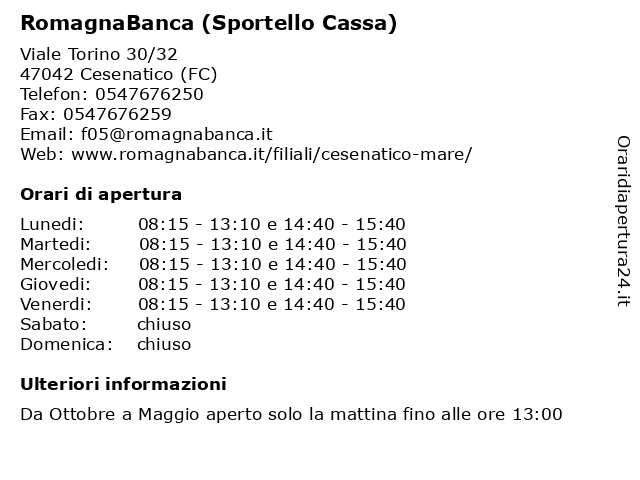 1 RomagnaBanca (Sportello Cassa) (distanza: 2,94 km) Via delle Nazioni 134, 47043 Gatteo (sportello, banca, cassa), finanziamenti, prelievi, romagnabanca, servizi bancari 2 RomagnaBanca (Sportello Cassa) (distanza: 7,54 km) Via Properzio 13, 47813 Bellaria Igea Marina (RN) (sportello, banca, bancomat, cassa), contanti, finanziamenti, mutui, prelievi, risparmi, romagnabanca, soldi 3 RomagnaBanca (ATM/Cassa Continua) (distanza: nan km) Viale Torino 30/32, 47042 Cesenatico (FC) (atm/cassa, (bancomat), banca, bancomat, contanti, continua), finanziamenti, mutui, prelievi, risparmi, romagnabanca, soldi 4 RomagnaBanca (Consulenza) (distanza: nan km) Viale Torino 30/32, 47042 Cesenatico (FC) (consulenza), banca, finanziamenti, prelievi, romagnabanca, servizi bancari 5 CASSA DI RISPARMIO DI CESENA (distanza: 0,99 km) Viale Carducci 104, 47042 Cesenatico carta prepagata my wu, cassa, cesena, conto bancario, di, incassare denaro, inviare denaro online, money transfer, my wu, pagamenti internazionali, pagamento cash, pagamento online, quick pay, ricevere denaro, risparmio, spedire denaro, trasferimento denaro, trasferimento di denaro a un conto bancario 6 Cassa di Risparmio di Cesena (Bancomat ) (distanza: 1,01 km) Viale Carducci 104, 47042 Cesenatico (bancomat, atm, bancomat, cassa, cesena, contanti, conto corrente, di, prelievi, ricariche telefoniche, risparmi, risparmio, versamenti |