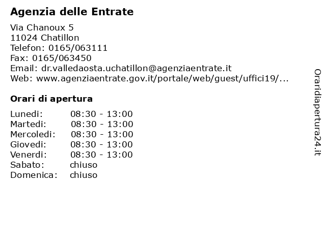 1 Comune di Ayas (Ufficio Tributi ed Altre Entrate) (distanza: 9,78 km) Route Barmasc snc, 11020 Antagnod - Ayas (ufficio, altre, ayas, comune, entrate), servizi comunali, tributi, uffici, uffici comunali 2 Comune di Champorcher,ufficio tributi e altre entrate (distanza: 12,04 km) Frazione Castello 1, 11020 Champorcher altre, champorcher, comune, di, entrate, tributi, uffici, ufficio 3 Agenzia delle Entrate (Sportello Riscossione) (distanza: 22,42 km) Viale Chabod 46, 11100 Aosta (sportello, agenzia, assistenza, delle, entrate, pagamenti, riscossione, riscossione) 4 Agenzia Delle Entrate - Assistenza Catastale E Ipotecaria (distanza: 23,13 km) Piazza della Repubblica 15, 11100 Aosta agenzia, agenzia delle entrate, assistenza, catastale, catasto, cittadino, d'aosta), delle, documentazione, entrate, fisco, ipoteca, ipotecaria, pagamenti, servizi, territorio, tributi, ufficio 5 Comunità Montana Grand Combin, Servizio Associato Entrate (distanza: 23,43 km) Localita' Chez Roncoz 65, 11010 Gignod assistenza, associato, combin, comunità, entrate, grand, montana, servizi, servizio 6 Agenzia delle entrate di Rivarolo Canavese (distanza: 47,44 km) Via Natale Gallo Pecca 18, 10086 Rivarolo Canavese (TO) 730, agenzia, canavese, debiti, delle, di, entrate, rivarolo |