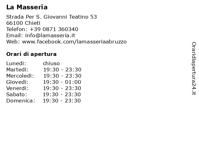 1 La Masseria (distanza: 0,22 km) Strada per San Giovanni Teatino 53, 66100 Chieti cibo, gastronomia, la, mangiare, masseria, ristorante 2 La Masseria (distanza: 0,22 km) Strada per San Giovanni Teatino 53, 66010 Chieti gastronomia, la, masseria, ristorante 3 Ada Masseria (distanza: 11,64 km) Via Po s.n.c., 65010 Collecorvino ada, agriturismo, albergo, b&b, camere, masseria, pernottamenti, ristorante, turismo, vacanze 4 Masseria Casamarte (distanza: 13,22 km) Via Bassino Casamarte 3, 65010 Collecorvino casamarte, eventi, location, masseria, matrimoni, ristorante 5 Macelleria La Masseria (distanza: 14,23 km) Via Piceni 31/4-31/7, 65015 Montesilvano gastronomia, la, macelleria, masseria 6 Masseria Ciavolich B&B (distanza: 15,56 km) Contrada Salmacina 11, 65014 Loreto Aprutino b&b, camere, ciavolich, masseria, pernottamenti, turismo, vacanze |