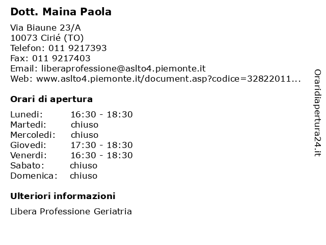 1 Mototouring s.n.c. Di Maina Claudio e Ruffina Roberto (distanza: 15,54 km) Via Schiapparelli 43, 10036 Settimo Torinese claudio, maina, motocicli, mototouring, rivend, roberto, ruffina 2 Lhara Maina (distanza: 16,80 km) Via Domenico Cimarosa 6/8, 10093 Collegno art, comm, dett, lhara, maina, regalo, souvenir 3 Dott. Federico Maina (distanza: 17,50 km) Via Luigi Einaudi 2, 10093 Collegno ambulatori, analisi, cura della persona, cure, dott., federico, maina, medici, medicina, sanità, visite mediche 4 Polisportiva Pozzo Maina (distanza: 17,62 km) Via Monte Ortigara 78, 10141 Torino maina, polisportiva, pozzo 5 Avvocato Maina Pier Carlo (distanza: 18,27 km) Via Meucci 1, 10122 Torino avvocati, avvocato, carlo, legge, maina, pier, studio legale, tribunale 6 Avvocato Maina Simone (distanza: 18,31 km) Via Bertolotti 2, 10121 Torino avvocati, avvocato, legge, maina, simone, studio legale, tribunale |