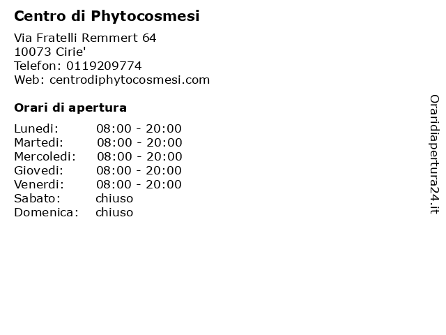 1 Centro Di Phytocosmesi SNC (distanza: 0,00 km) Via Remmert Fratelli 68, 10073 Cirie' centro, phytocosmesi, salone di bellezza |