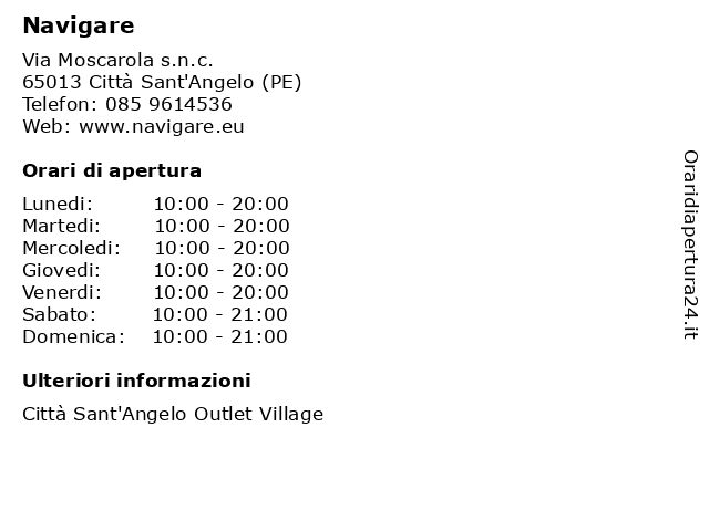 1 Navigare (distanza: 4,66 km) Via moscarola snc, 65013 Città Sant'Angelo abbigliamento, accessori, navigare 2 Navigare (Orario Estivo) (distanza: 0,46 km) Via Moscarola s.n.c., 65013 Città Sant'Angelo (orario, abbigliamento, accessori, estivo), fashion, moda, navigare, vestiti 3 Navigare l'Abruzzo Asd (distanza: 5,95 km) Via Nazionale Adriatica Nord 345, 65125 Pescara asd, azienda, cliente, fabbrica, l'abruzzo, navigare, vendita 4 Bata (distanza: 0,00 km) Contrada Muscarola s.n.c., 65013 Città S. Angelo accessori, bambino, bata, calzature uomo, donna 5 Bata (dal 18/08) (distanza: 0,00 km) Contrada Muscarola s.n.c., 65013 Città S. Angelo (dal, 18/08), accessori, bambino, bata, calzature uomo, donna 6 Amy Gee (distanza: 0,00 km) Via Moscarola, s.n.c., 65013 Città Sant'Angelo PE abbigliamento, accessori, amy, donna, gee, uomo |