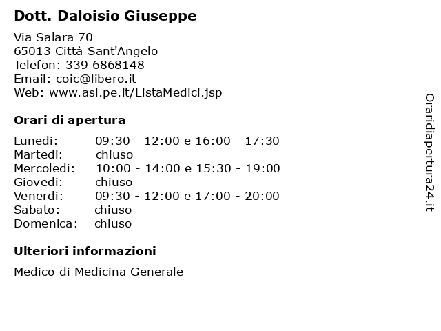 1 Dott. Daloisio Giuseppe (distanza: 1,78 km) Via L. Petruzzi 62, 65013 Città Sant'Angelo ambulatorio, cura della persona, daloisio, dott., giuseppe, medicina, medico, prevenzione, salute 2 Dott. Daloisio Giuseppe (distanza: 6,04 km) Largo Baiocchi snc, 65013 Città Sant'Angelo ambulatorio, cura della persona, daloisio, dott., giuseppe, medicina, medico, prevenzione, salute 3 Dott. Daloisio Giuseppe (distanza: 6,32 km) Via Vico I S. Chiara 4, 65013 Città Sant'Angelo ambulatorio, cura della persona, daloisio, dott., giuseppe, medicina, medico, prevenzione, salute 4 Dott.ssa Filice Adele (distanza: nan km) Via Salara 70, 65013 Città Sant'Angelo adele, ambulatorio, cura della persona, dott.ssa, filice, medicina, medico, prevenzione, salute 5 Dott.ssa Gorgoretti Valeria (distanza: nan km) Via Salara 70, 65013 Città Sant'Angelo ambulatorio, cura della persona, dott.ssa, gorgoretti, medicina, medico, prevenzione, salute, valeria 6 Dott.ssa Patacchini Claudia (distanza: nan km) Via Salara 70, 65013 Città Sant'Angelo ambulatorio, claudia, cura della persona, dott.ssa, medicina, medico, patacchini, prevenzione, salute |