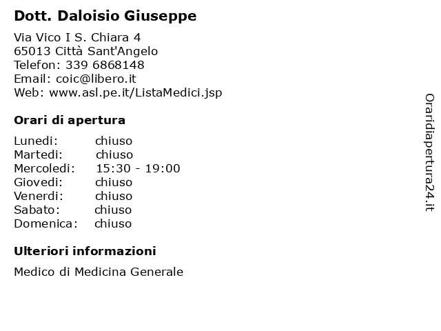 1 Dott. Daloisio Giuseppe (distanza: 0,35 km) Largo Baiocchi snc, 65013 Città Sant'Angelo ambulatorio, cura della persona, daloisio, dott., giuseppe, medicina, medico, prevenzione, salute 2 Dott. Daloisio Giuseppe (distanza: 4,56 km) Via L. Petruzzi 62, 65013 Città Sant'Angelo ambulatorio, cura della persona, daloisio, dott., giuseppe, medicina, medico, prevenzione, salute 3 Dott. Daloisio Giuseppe (distanza: 6,32 km) Via Salara 70, 65013 Città Sant'Angelo ambulatorio, cura della persona, daloisio, dott., giuseppe, medicina, medico, prevenzione, salute 4 Dott.ssa Filice Adele (distanza: 0,01 km) Via Vico S. Chiara snc, 65013 Città Sant'Angelo adele, ambulatorio, cura della persona, dott.ssa, filice, medicina, medico, prevenzione, salute 5 Dott.ssa Sagazio Daniela (distanza: 0,06 km) Corso Vittorio Emanuele 68, 65013 Città Sant'Angelo ambulatorio, cura della persona, daniela, dott.ssa, medicina, medico, prevenzione, sagazio, salute 6 Pizzeria Del Corso Di Giuseppe Di Marco e c. Snc (distanza: 0,11 km) Corso Vittorio Emanuele 31, 65013 Citta' Sant'Angelo catering, giuseppe, marco, pizzeria, ristoranti |