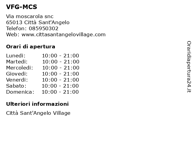 1 MCS&Co. Outlet Store (distanza: 4,66 km) Via Moscarola s.n.c., 65013 Città Sant'Angelo (PE) abbigliamento, accessori, donna, mcs&co., outlet, store, uomo 2 MCS&Co. Outlet Store (Orario Estivo) (distanza: 4,93 km) Via Moscarola s.n.c., 65013 Città Sant'Angelo (orario, abbigliamento, accessori, estivo), fashion, mcs&co., moda, outlet, store, vestiti 3 MCS Marlboro Country Style (distanza: 51,54 km) Via del Commercio 52, 63100 Ascoli Piceno (c.c., abbigliamento country, al, battente), country, marlboro, mcs, mosa, style |