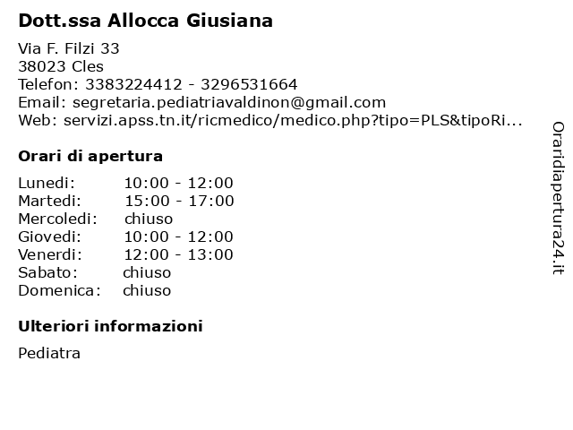 1 Dott.ssa Allocca Giusiana (distanza: 3,57 km) Via G. Marconi 54, 38020 Livo allocca, ambulatorio, dott.ssa, giusiana, medicina, medico, medico di famiglia, pediatra, sanità, studio medico, visite 2 Dott.ssa Allocca Giusiana (distanza: 11,06 km) Via Cesare Battisti 55, 38013 Fondo allocca, ambulatorio, dott.ssa, giusiana, medicina, medico, medico di famiglia, pediatra, sanità, studio medico, visite 4 Famiglia Coop Val Di Non Soc Coop (distanza: 0,62 km) Via Don Franz Xavier Mitterer 13, 38023 Cles alimentari, comm, coop, dett, famiglia, non, prod, soc, val, vari 5 Coop (distanza: 0,92 km) Piazzetta De Bertolini 7, 38023 Cles alimentari, anaunia, comm, coop, dett, famiglia, prod, soc, vari 6 Dott. Galuppi Alberto (distanza: 0,94 km) Piazza Granda 13, 38023 Cles alberto, ambulatorio, dott., galuppi, medicina, medico, medico di famiglia, pediatra, sanità, studio medico, visite |