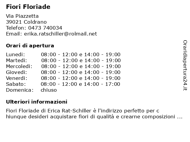 | Venerdi | 08:00-12:00 e 14:00-19:00 |