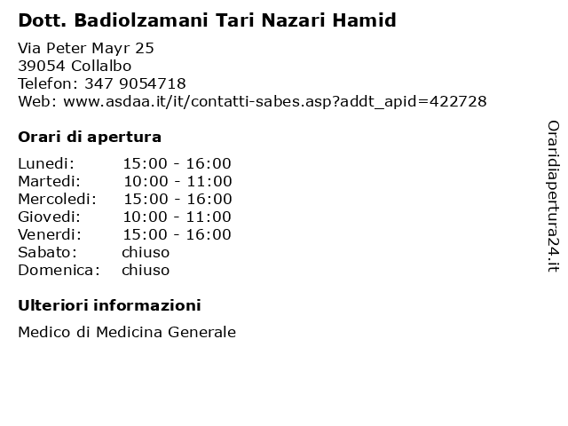 Tag di ricerca per Dott. Badiolzamani Tari Nazari Hamid:anna, visita, ambulatori, studi, dott., dr.ssa, dottore, circoscrizione, guarigione, medico di base, medico di famiglia, pediatra, tari, hamid, thurner, nazari, badiolzamani |