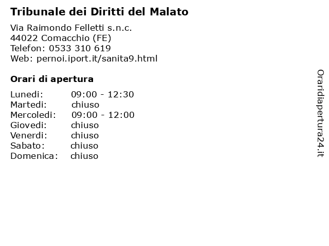 1 Cittadinanzattiva - Tribunale dei Diritti del Malato (distanza: 31,79 km) Via Fiume Abbandonato 134, 48123 Ravenna associazioni, circoli, cittadinanzattiva, comune, comunità, dei, del, diritti, malato, tribunale 2 Associazione Volontari Diritti del Malato (distanza: 31,98 km) Viale Randi 5, 48121 Ravenna aiuto, aiuto ai cittadini, associazione, del, diritti, informazione, malato, tutela ai cittadini, volontari, volontariato 3 Associazione Volontari Diritti del Malato (distanza: 33,33 km) Via Sansovino 57, 48124 Ravenna (RA) aiuto, aiuto ai cittadini, associazione, del, diritti, informazione, malato, tutela ai cittadini, volontari, volontariato 4 Cittadinanzattiva - Tribunale per i Diritti del Malato (distanza: 37,31 km) Via Masi 22 c/o CUP, 48022 Lugo (RA) associazione, cittadinanzattiva, del, diritti, diritti del malato, malato, per, tribunale 5 Tribunale dei Diritti del Malato Ospedale Umberto (orario invernale) (distanza: 37,53 km) Viale Masi 22, 48022 Lugo (Ravenna) (orario, associazione, dei, del, diritti, invernale), malato, ospedale, tribunale, umberto, volontariato 6 Tribunale dei Diritti del Malato (Orario Estivo) (distanza: 37,53 km) Viale Masi 22, 48022 Lugo (RA) (orario, associazione, dei, del, diritti, estivo), malato, ospedale, tribunale, umberto, volontariato |