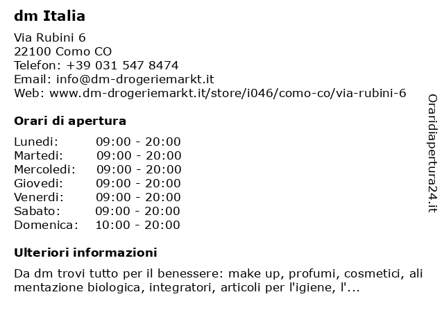 1 dm Italia (distanza: 13,93 km) Via Maria Farneti 1, 20823 Lentate sul Seveso MB alimentazione bio, cosmesi, cura casa, cura della persona, dm, drogeria, infanzia, italia, make-up, profumi, salute, shop online 2 dm Italia (distanza: 19,36 km) Via Manzoni 3, 21100 Varese VA alimentazione bio, cosmesi, cura casa, cura della persona, dm, drogeria, infanzia, italia, make-up, profumi, salute, shop online 4 DM Pane & Caffé (distanza: 2,54 km) Via Lissi 15, 22100 Como bar, caffetteria, caffè, caffé, dm, pane, pane&caffè, pannetteria 5 DM Metal Manufacturing Srl (distanza: 12,77 km) Via Roma 27a, 22046 Erba azienda, cliente, dm, fabbrica, manufacturing, metal, srl, vendite 6 DM Technical Project (distanza: 15,95 km) Via Giotto 2, 22066 Mariano Comense design di interni, dm, project, technical |