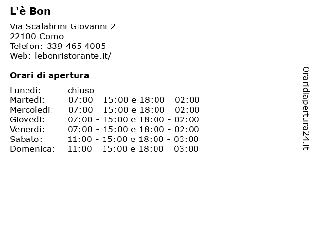| Sabato | 11:00-15:00 e 18:00-03:00 |