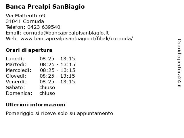 1 Banca Prealpi SanBiagio (distanza: 3,74 km) Via Erizzo 381, 31030 Valdobbiadene attività bancarie, banca, denaro, pacchi, prealpi, sanbiagio, trasferimenti, vaglia postali 2 Banca Prealpi SanBiagio (distanza: 6,82 km) Via XXX Aprile 5/7, 31044 Montebelluna attività bancarie, banca, denaro, pacchi, prealpi, sanbiagio, trasferimenti, vaglia postali 3 Banca Prealpi SanBiagio (distanza: 6,88 km) Piazza Gildo e Dina Guarnier 2, 31040 Pederobba banca, finanziamenti, prealpi, prelievi, prestiti, sanbiagio, versamenti 4 Banca Prealpi SanBiagio (distanza: 9,82 km) Via Castelletto 94, 31010 Farra di Soligo attività bancarie, banca, denaro, pacchi, prealpi, sanbiagio, trasferimenti, vaglia postali 5 Banca Prealpi SanBiagio (distanza: 14,46 km) Piazza Vittorio Emanuele II 13, 31053 Pieve di Soligo attività bancarie, banca, denaro, pacchi, prealpi, sanbiagio, trasferimenti, vaglia postali 6 Banca Prealpi SanBiagio (distanza: 16,06 km) Via Maestra 6, 31051 Follina attività bancarie, banca, denaro, pacchi, prealpi, sanbiagio, trasferimenti, vaglia postali |