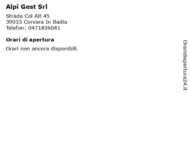 1 Alpi Gest Srl (distanza: 0,13 km) Via Centro 215, 39033 Corvara In Badia abbigl, acces, alpi, comm, dett, gest, rag, uomo 2 Hotel Alpi | Dolomiti | Val di Fassa (distanza: 12,27 km) Strčda Dolomites 24, 38031 Campitello alpi, b&b, di, dolomiti, fassa, hotel, resort, val 3 Alpi Sas Di Georg Vinatzer e Co (distanza: 15,56 km) Via Rezia 116, 39046 Ortisei alpi, bar, birrerie, georg, paninoteche, vinatzer 6 Hotel Bw Hotel Alpi (distanza: 40,23 km) Via Alto Adige 35, 39100 Bolzano albergo, alpi, appartamenti. piscina, b&b, bw, camere, dormire, hotel, pernottamenti |