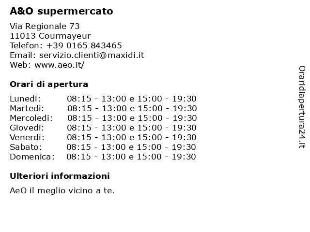 | Sabato | 08:15-13:00 e 15:00-19:30 |