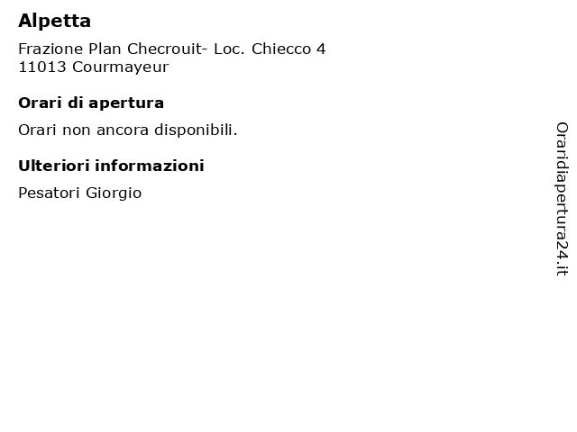 1 Ristorante Alpetta (distanza: 2,19 km) Loc. Chiecco - Plan Chécrouit snc, 11013 Courmayeur (AO) alpetta, cucina casalinga, cucina classica, cucina valdostana, ristorante 2 Rifugio Giorgio Bertone (distanza: 2,19 km) Località Pré - Mont de la Saxe snc, 11013 Courmayeur (AO) bertone, cucina valdostana, giorgio, rifugio 3 Arzeillen Di Giorgio Carrel Snc (distanza: 8,66 km) Localita' Les Suches, 11016 La Thuile arzeillen, carrel, catering, giorgio, ristoranti 4 Le Coq Hardi (distanza: 25,70 km) Frazione Saint Maurice 189, 11010 Sarre bar, birrerie, coq, cosmea, favre, giorgio, hardi, paninoteche 5 L.g.a. Snc Di Zovi Luciana e Sabatino Giorgio (distanza: 29,38 km) Piazza Della Repubblica Snc, 11100 Aosta edicole, giorgio, giornalai, luciana, sabatino, zovi 6 L.g.a. Snc Di Zovi Luciana e Sabatino Giorgio (distanza: 29,43 km) Via Monte Grappa 2, 11100 Aosta edicole, giorgio, giornalai, luciana, sabatino, zovi |