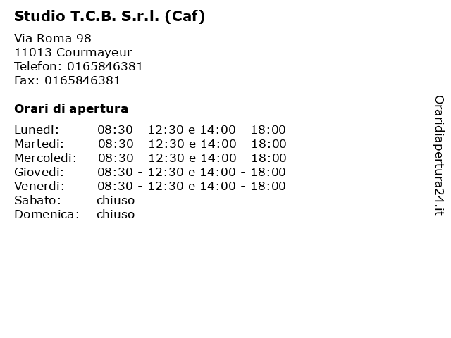 | Venerdi | 08:30-12:30 e 14:00-18:00 |