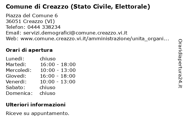 1 Comune di Creazzo (Stato Civile, Elettorale) (distanza: 0,00 km) Piazza del Comune 6, 36051 Creazzo (VI) (stato, civile, civile), comune, creazzo, elettorale), servizi, utente 2 Comune di Monteviale (Elettorale) (distanza: 3,56 km) Via A. Cibele 15, 36050 Monteviale (VI) (elettorale), comune, di, monteviale, servizi, utente 3 Comune di Vicenza (Ufficio Elettorale) (distanza: 4,55 km) Viale Torino 19, 36100 Vicenza (VI) (ufficio, comunale, comune, di, elettorale), servizi, vicenza 4 Comune di Caldogno (Elettorale ) (distanza: 9,11 km) Via Dante 75, 36030 Caldogno (VI) (elettorale, caldogno, comune, di, servizi, utente 5 Comune di Longare (Ufficio Elettorale) (distanza: 11,61 km) Via G.Marconi .26, 36026 Longare (ufficio, comunale, comune, di, elettorale), longare, nazionale, servizio, ufficio 6 Comune di Quinto Vicentino (Ufficio Elettorale e Leva) (distanza: 12,27 km) Piazza IV Novembre 2, 36050 Quinto Vicentino (VI) (elettorale, (ufficio, comune, di, elettorale, leva), quinto, servizi, utente, vicentino |