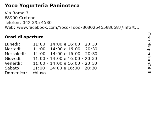 | Lunedi | 11:00-14:00 e 16:00-20:30 |