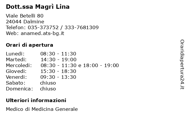 Mercoledi | 08:30-11:30 e 18:00-19:00 |