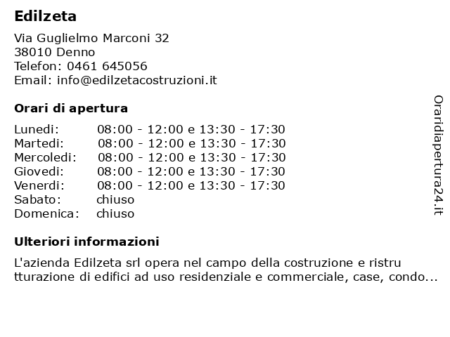 | Lunedi | 08:00-12:00 e 13:30-17:30 |