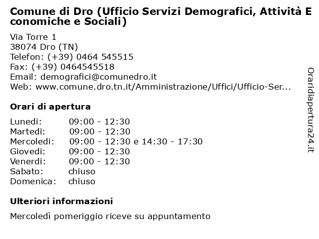 1 Comune di Dro (Ufficio Servizi Demografici, Attività Economiche e Sociali) (distanza: 0,00 km) Via Torre 1, 38074 Dro (TN) (attività, (ufficio, attività, comune, demografici, dro, economiche, economiche), servizi, sociali), utente 2 Comune di Drena (Ufficio Servizi Demografici, Attività Economiche e Sociali) (distanza: 0,00 km) Via Torre 1, 38074 Dro (TN) (ufficio, attività, comune, demografici, drena, economiche, servizi, sociali), uffici, ufficio 3 Comune di Dro (Attività sociali) (distanza: 0,09 km) Via Torre 1, 38074 Dro - TN (attività, comune, di, dro, servizi, sociali), utente 4 Comune di Riva del Garda (Ufficio Attività Economiche) (distanza: 10,22 km) Piazza III Novembre 5, 38066 Riva del Garda (ufficio, attività, attività economiche, comune, del, di, economiche), garda, riva, riva del garda, servizi comunali, uffici comunali 5 Comune di Riva del Garda (Ufficio Attività Economiche, Sport, Turismo e Manifestazioni) (distanza: 10,23 km) Piazza III Novembre 5, 38066 Riva del Garda (ufficio, attività, attività culturali, comune, cultura, culturali, economiche, garda, manifestazioni), riva, riva del garda, servizi comunali, sport, turismo, turismo), uffici comunali 6 Agenzia Provinciale per l’Incentivazione delle Attività Economiche (APIAE) - Trentino Sviluppo (distanza: 12,04 km) Via Fortunato Zeni 8, 38068 Rovereto (apiae), agenzia, attività, delle, economiche, l’incentivazione, per, provinciale, servizi, sviluppo, tecnologia, trentino |