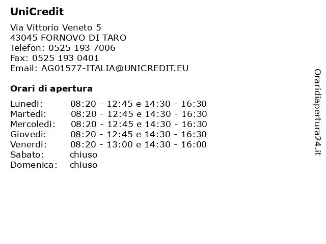 1 Unicredit (distanza: 4,50 km) Via della Repubblica 30, 43014 Medesano assicurazione per la casa, assicurazione per la persona, banca, bancomat, carta prepagata, conto, creditexpress dynamic, finanziamenti, genius first, genius smart, investimenti, mutui, prestiti personali, super genius 2.0, unicredit, unicreditcard click, unicreditcard flexia classic 4 Unicredit (distanza: 12,73 km) Via Gramsci 26, 43015 Noceto assicurazione per la casa, assicurazione per la persona, banca, carta prepagata, conto, creditexpress dynamic, finanziamenti, genius first, genius smart, investimenti, mutui, prestiti personali, super genius 2.0, unicredit, unicreditcard click, unicreditcard flexia classic 6 |