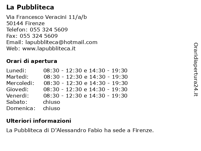 | Lunedi | 08:30-12:30 e 14:30-19:30 |