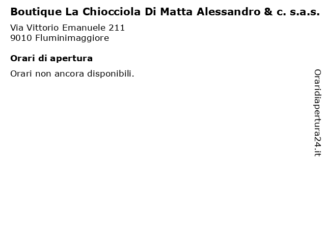 1 Matta Alessandro (distanza: 0,63 km) Via Aru a. 3/b, 09010 Fluminimaggiore agenti, alessandro, assicuraz, matta, serv 2 Boutique l'Uomo (distanza: 14,01 km) Via Baudi Di Vesme 15, 09016 Iglesias antonio, boutique, eredi, giovanni, luigi, meloni, mercerie, uomo 3 The Owl Boutique (distanza: 14,03 km) Via Cagliari 27, 09016 Iglesias boutique, moda, negozio d'abbigliamento, owl, the, theowl 4 Boutique Monica (distanza: 14,10 km) Corso Matteotti 39, 09016 Iglesias abbigl, acces, badalamenti, benedetto, boutique, comm, dett, monica, rag, uomo 5 Boutique Del Fiore Di Garia Danilo e c. Sas (distanza: 14,16 km) Via Gramsci Sn, 09016 Iglesias art, boutique, comm, danilo, dett, fiore, garia, giardin, serra 6 Titti Curvy Boutique (distanza: 14,25 km) Via Garibaldi 11, 09016 Iglesias abbigliamento, boutique, curvy, donna, femminile, negozio, taglie comode, titti, vendita |