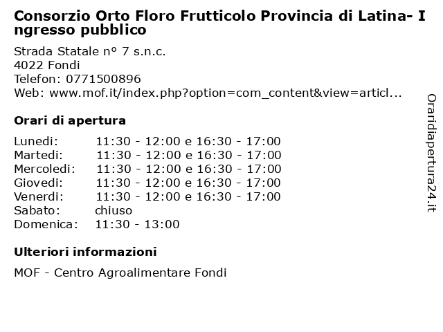 1 MOF Centro Agroalimentare - ingresso per il pubblico (distanza: 0,00 km) Strada Statale 7 s.n.c., 04022 Fondi agroalimentare, alimenti, centro, cibo, il, ingresso, mof, per, pubblico 2 A. & D. Ortofrutta - Ingresso pubblico (distanza: 0,00 km) Strada Statale n° 7 s.n.c., 04022 Fondi a., d., ingresso, ingrosso, mercati, ortofrutta, pubblico 3 A.L. Ortofrutta - Ingresso pubblico (distanza: 0,00 km) Strada Statale n° 7 s.n.c., 04022 Fondi a.l., ingresso, ingrosso, mercati, ortofrutta, pubblico 4 Acropolis srl- Ingresso pubblico (distanza: 0,00 km) Strada Statale n° 7 s.n.c., 04022 Fondi acropolis, ingresso, ingrosso, mercati, pubblico, srl 5 Agrofrutta Uno srl- Ingresso pubblico (distanza: 0,00 km) Strada Statale n° 7 s.n.c., 04022 Fondi agrofrutta, ingresso, ingrosso, mercati, pubblico, srl, uno 6 Antonellla Expo Srl - Ingresso pubblico (distanza: 0,00 km) Strada Statale n° 7 s.n.c., 04022 Fondi antonellla, expo, ingresso, ingrosso, mercati, pubblico, srl |