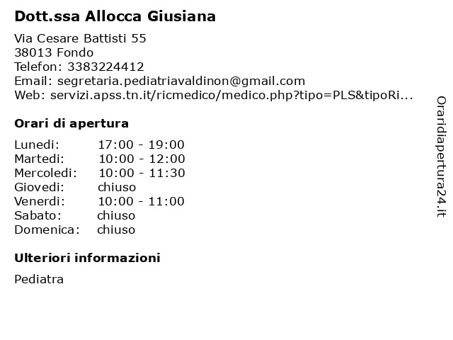 1 Dott.ssa Allocca Giusiana (distanza: 9,85 km) Via G. Marconi 54, 38020 Livo allocca, ambulatorio, dott.ssa, giusiana, medicina, medico, medico di famiglia, pediatra, sanità, studio medico, visite 2 Dott.ssa Allocca Giusiana (distanza: 11,06 km) Via F. Filzi 33, 38023 Cles allocca, ambulatorio, dott.ssa, giusiana, medicina, medico, medico di famiglia, pediatra, sanità, studio medico, visite 4 Dott.ssa Meo Alessandra (distanza: 0,02 km) Via Cesare Battisti 55, 38013 Borgo d'Anaunia alessandra, ambulatorio, dott.ssa, medicina, medico, medico di famiglia, meo, pediatra, sanità, studio medico, visite 5 Famiglia Coop Val Di Non Soc Coop (distanza: 0,16 km) Via Battisti 20, 38013 Fondo coop, famiglia, supermercati, val 6 Famiglia Coop Val Di Non Società Cooperativa (distanza: 2,94 km) Via Roma 79, 38011 Cavareno alimentari, comm, coop, cooperativa, dett, di, famiglia, non, prod, soc, società, val, vari |