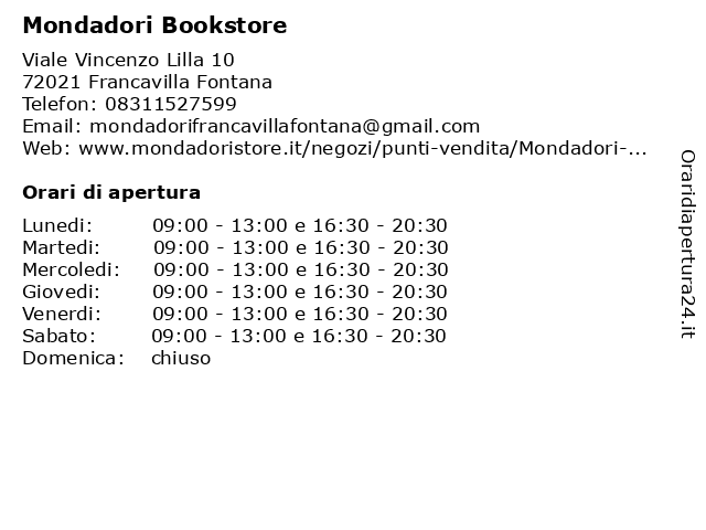 1 Mondadori Bookstore (distanza: 12,71 km) Via Matteotti 35/37, 74023 Grottaglie bookstore, cultura, formazione, fumetto, gadget, istruzione, letteratura, lettura, libreria, libri, mondadori, narrativa, oggettistica, romanzo, scuola, studio 2 Mondadori Bookstore (distanza: 14,68 km) Via Francesco Petrarca 1, 72013 Ceglie Messapica bookstore, mondadori, negozi, point, store 3 Mondadori Bookstore (distanza: 14,72 km) Corso XX Settembre 37, 74024 Manduria bookstore, cultura, leggere, libreria, libri, mondadori 4 Mondadori Bookstore (distanza: 18,89 km) Via Marconi 133, 72023 Mesagne bookstore, cultura, formazione, fumetto, gadget, istruzione, letteratura, lettura, libreria, libri, mondadori, narrativa, oggettistica, romanzo, scuola, studio 5 Mondadori Point (distanza: 0,81 km) Via San Lorenzo 137, 72021 Francavilla Fontana (BR) cinema, ebook, ereader, games, giocattoli, idee regalo, libri, mondadori, musica, point, riviste 6 Mondadori Point (distanza: 17,80 km) Via Mesagne 84, 72019 San Vito Dei Normanni (BR) cinema, ebook, ereader, games, giocattoli, idee regalo, libri, mondadori, musica, point, riviste |